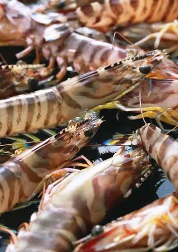 3. 斑节对虾(草虾/黑虎虾)特征:体型大(可达33厘米),壳厚带褐色条纹,煮熟后变红。东南亚常见,生长迅速。营养:虾青素含量高,烟酸和矿物质丰富。烹饪:因肉质较面,适合烤、油焖或咖喱烹饪。